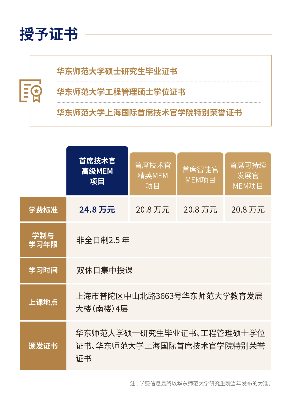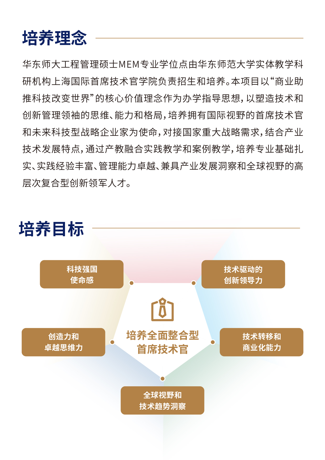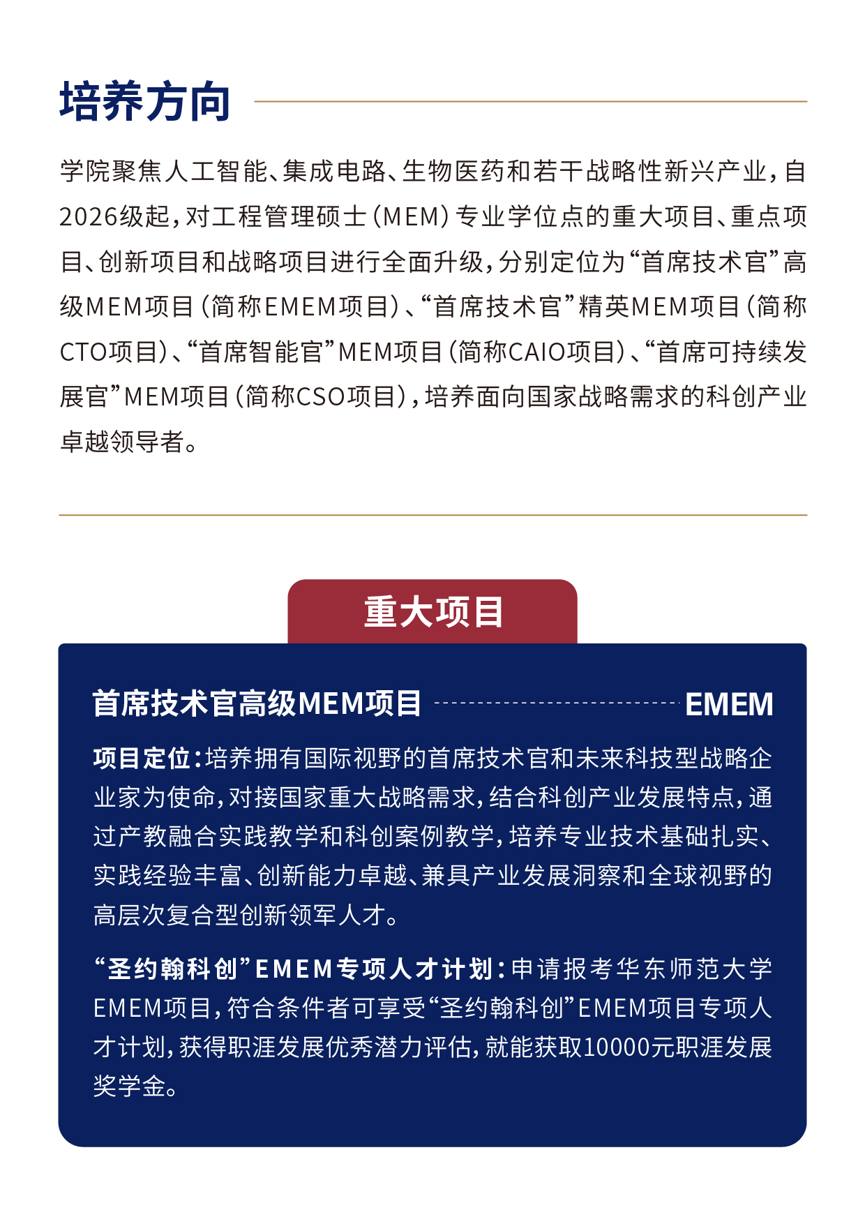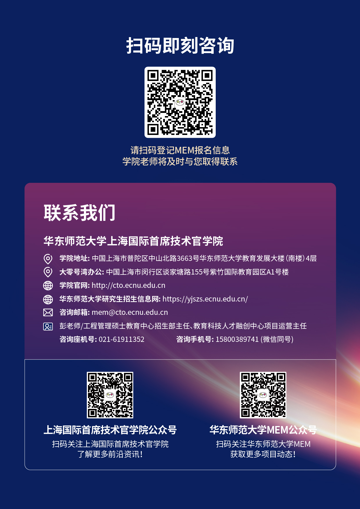 欢迎你报考华东师大工程管理硕士(MEM)!作为国内首创“高级定位”的MEM项目(含首席技术官方向、首席智能官方向、首席可持续发展官方向),我们聚焦培养未来产业技术领袖,塑造“技术+管理”复合型创新人才。在新人工智能时代,无论理工背景还是其他专业的在职考生,都能在这里构建职涯发展的核心竞争力,在为贡献于实现科技创新的社会价值中重塑身份、成就全新的自我。